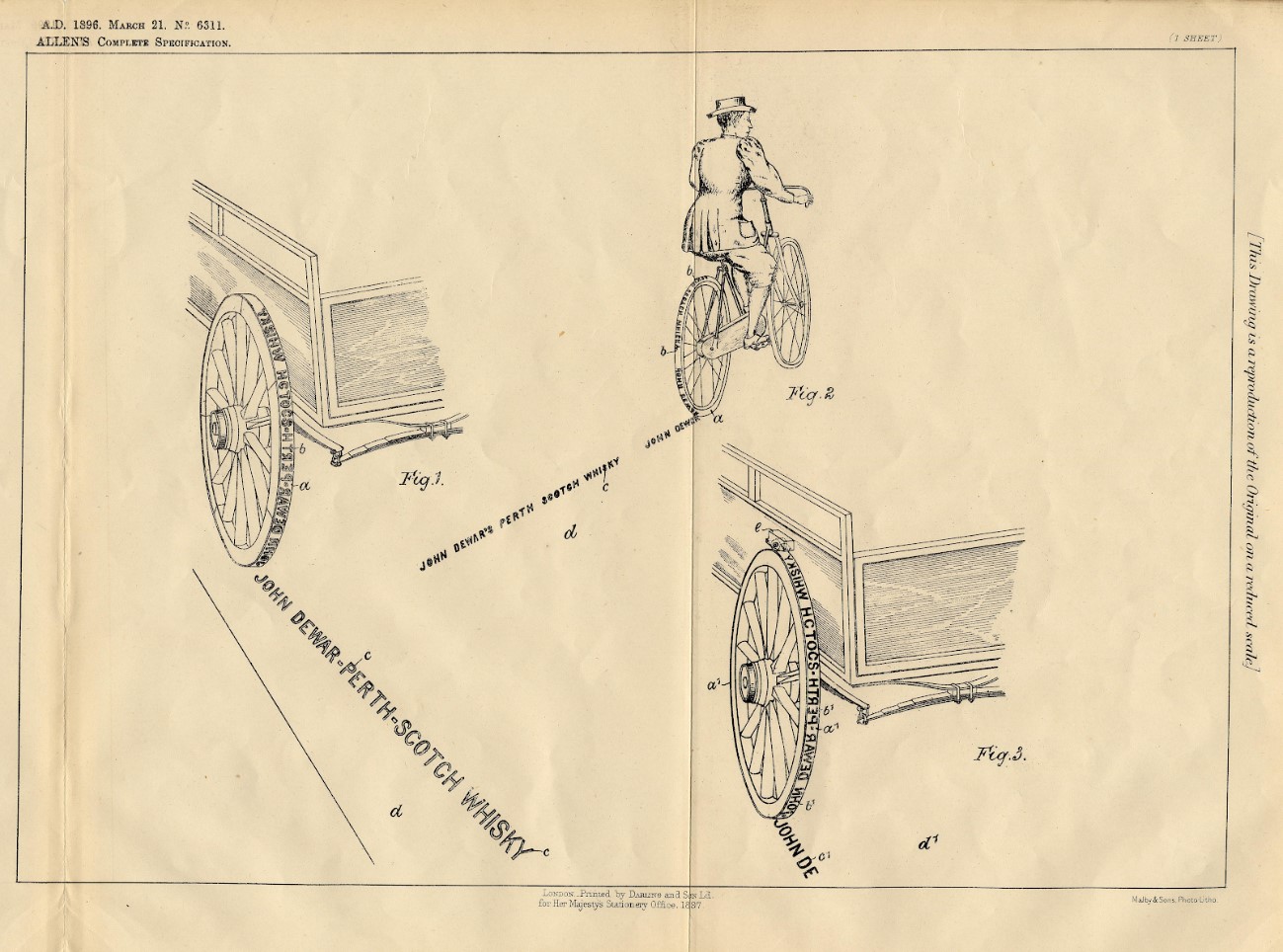 当初の目論見は崩れましたが、大都会ロンドンで家業のウイスキー「デュワーズ」を拡販する日々をトミーは送ります。そんな彼が取得した特許が今も記録に残っています。それは、自転車や馬車の車輪に逆さ文字で広告メッセージを刻印し、走った後のわだちにそれが残る、という広告のための装置です。