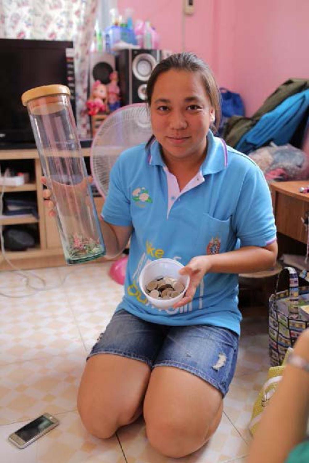 透明の貯金箱には、タイバーツ紙幣でつくった折りヅル