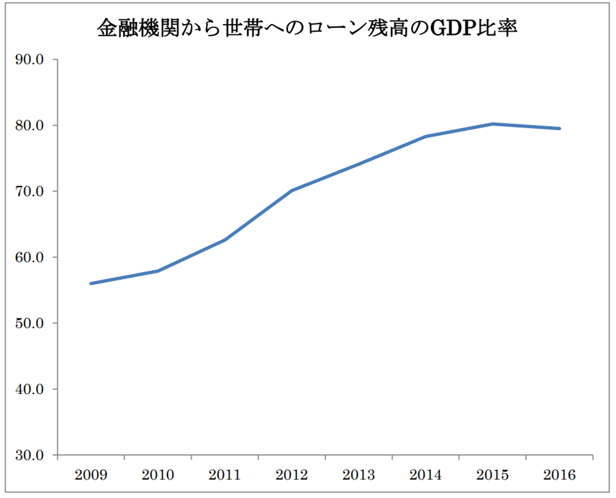 実際、タイ生活者のローン利用状況は、どうなっているのでしょうか。下記は、ローン残高がGDP比でどの程度積み上がっているかを示すデータです。このデータを見る限り、タイの生活者のローン残高は年々高まっていることが分かります。