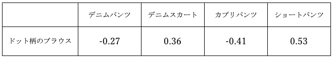 その他にもドット柄ブラウスを主力に据えたときのコーディネート提案をどうするのかを感覚ではなく相関係数を使って説明していく。