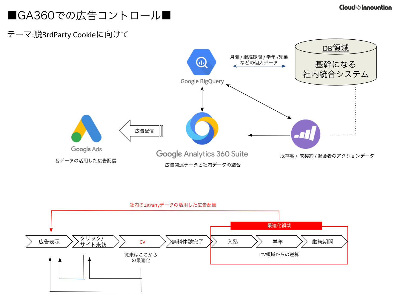すこしテクニカルな面に寄った話かもしれませんが、当面はGoogleアナリティクス360とMAツールとの連動に力を入れていきたいと考えています。たとえば、先ほどの学習塾の例で言えば、多くの企業がコンバージョンポイントとして設定しているのは、資料請求や無料体験です。しかし、ビジネス的な面から言えば、肝になるのは入会でしょう。