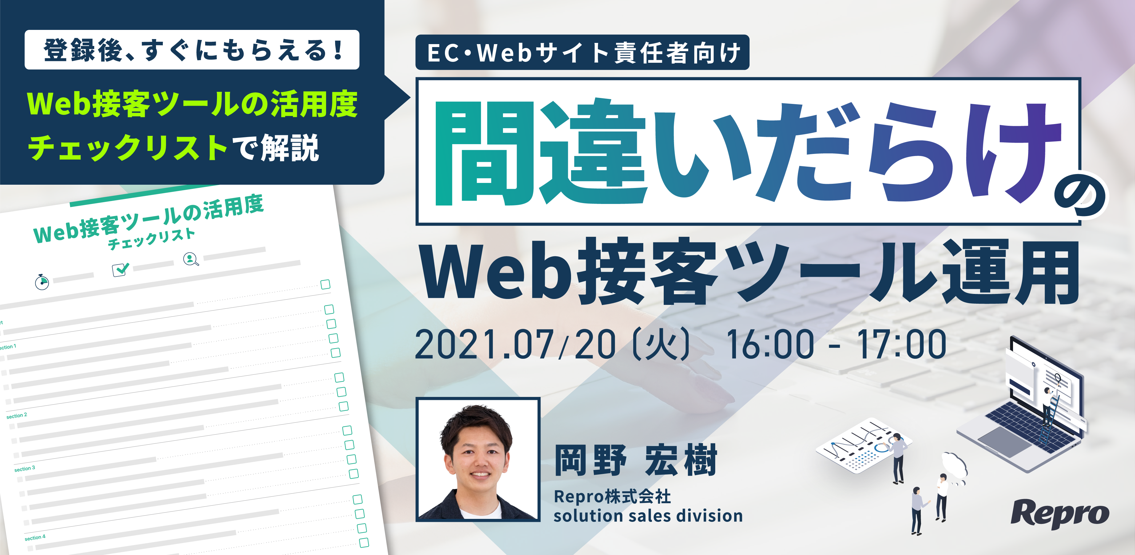 本文でご紹介したReproのプロフェッショナルチームの知見をもとに「10分でわかる!Web接客ツールの活用度チェックリスト」を作成しました。 7/20(火)には、こちらのチェックリストを元に、Web接客ツール運用の課題への打ち手をご紹介します。Web売上向上に課題をお持ちの方はぜひご参加ください。
