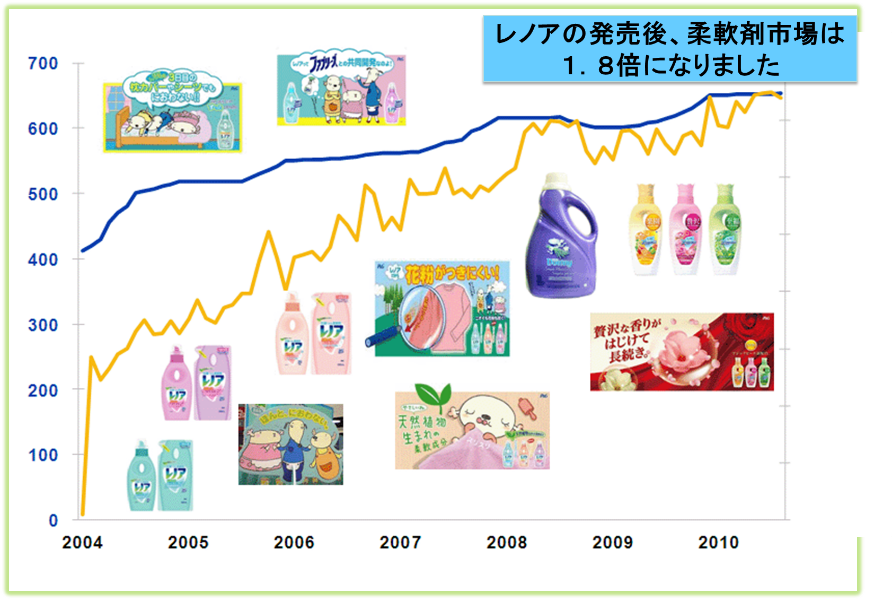 そこで開発されたのが、防臭効果をもった柔軟剤「レノア」です。新しく防臭効果を加えることで、市場創造とシェアの奪還を目指しました。そして見事に「レノア」は発売直後から爆発的に売れて、結果的に発売後6年間で柔軟剤市場を1.8倍に拡大することに貢献しました。