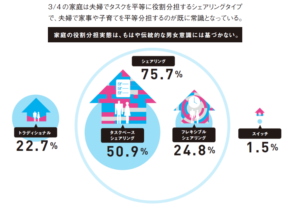 伝統的な役割分担のトラディショナルタイプは、約23%にとどまり、夫婦で平等に役割分担するシェアリングタイプが約76%と大多数を占めていることがわかります。