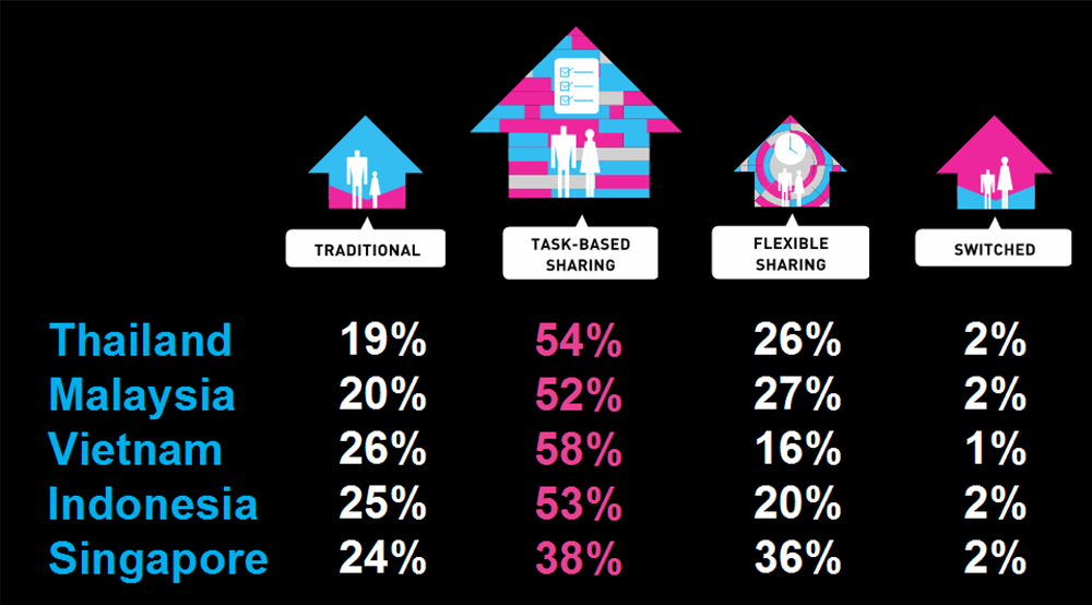 では、こうしたトラディショナルな夫婦の役割分担を行っている家庭は、アセアンの国々では依然としてメジャーな存在なのでしょうか。次の図は、各タイプ別の割合になります。
