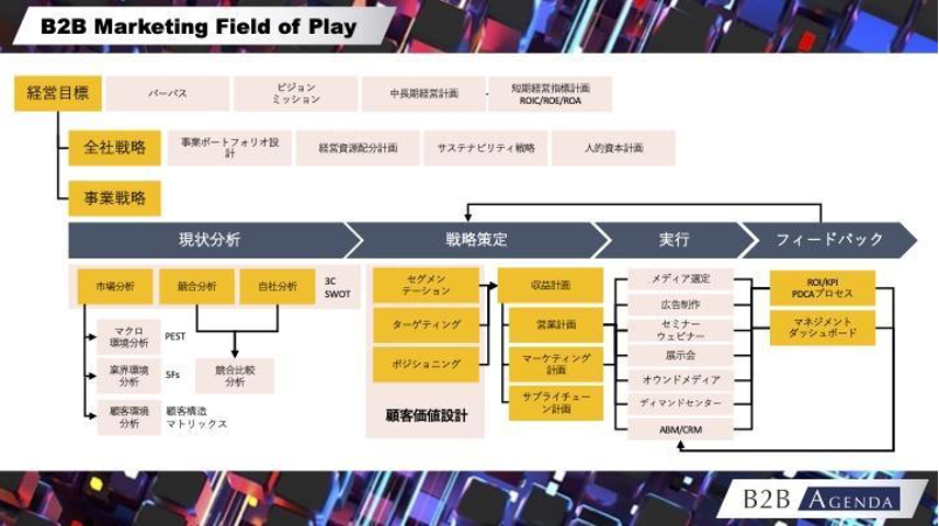 早速ですが、セッションの途中で甲斐氏から提示された「B2B Marketing Field of Play」というBtoBマーケティングの全体像を俯瞰した図を紹介します。この図がB2Bアジェンダの中で最も参考になったという参加者の意見も多く聞かれました。「BtoBマーケティング」と、ひと言で言っても、これだけ細分化され、どこのフェーズのどの部分を言っているのか、まずはそこの認識合わせが必要です。