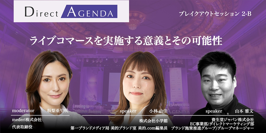 今回は、化粧品や美容法を紹介する映像をライブ配信してファンづくりに注力している資生堂ジャパン EC事業部/ダイレクトマーケティング部 ブランド施策推進グループ/グループマネージャーの山本雅文氏と、企画力や編集を活かして第三者の視点でユーザー読者とつな繋がる配信を行う小学館 第一ブランドメディア局 美的ブランド室.com 編集長の小林由佳氏がスピーカーとして登壇する。モデレーターは、オンラインピル処方サービスを展開するmederi 代表取締役の坂梨亜里咲氏が務め、ライブコマースの可能性に迫る。