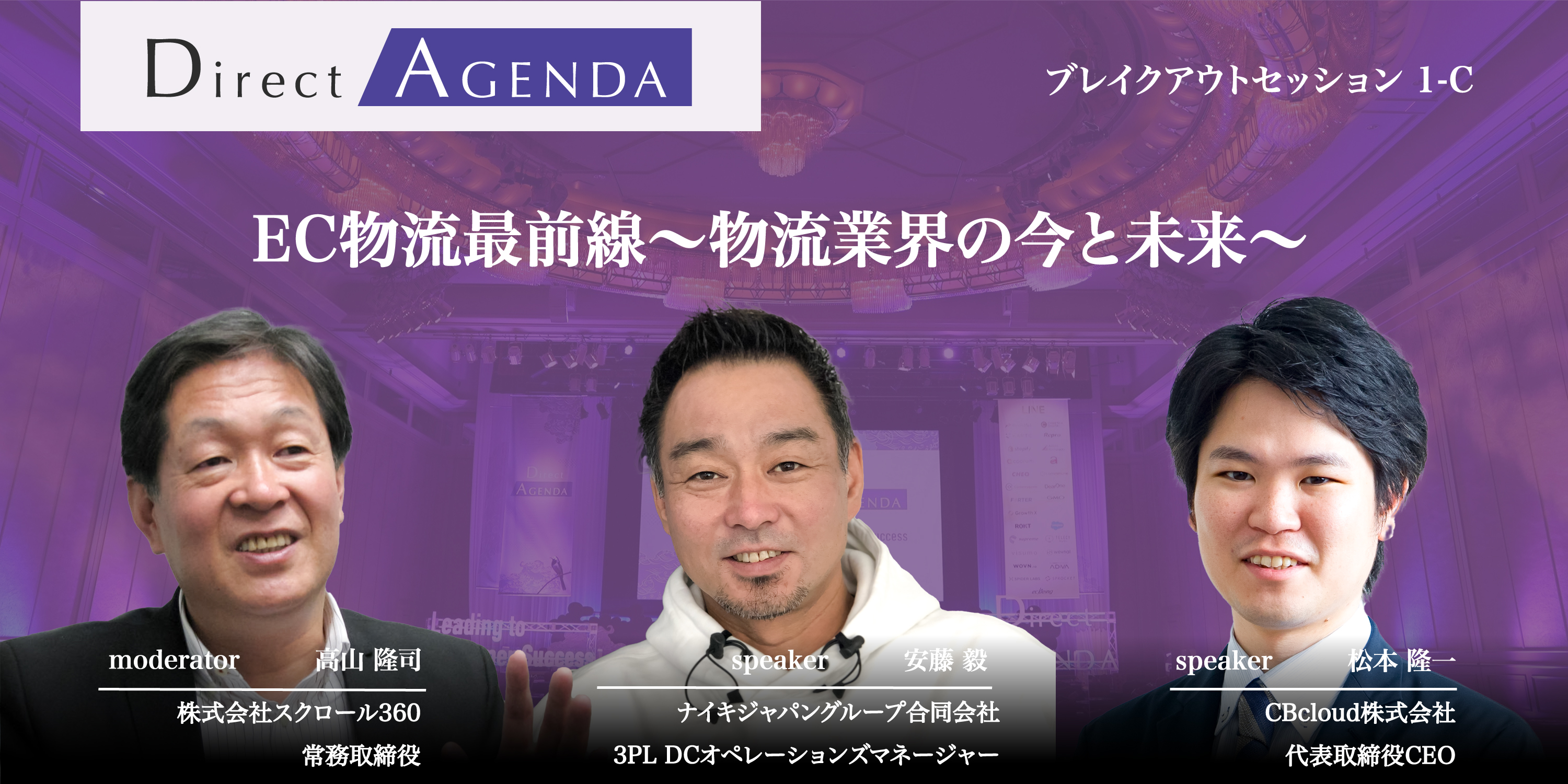 そこで今回は、荷物を届けたい人と配送パートナーを繋ぐ日本最大級の配送プラットフォーム「PickGo(ピックゴー)」を運営するCBcloud 代表取締役CEOの松本隆一氏と、最新の物流システムおよび機器を活用して、ECサイトからの注文の大量出荷を実現したナイキジャパングループ 3PL DCオペレーションマネージャーの安藤毅氏に、スクロール360 常務取締役の 高山隆司氏が切り込む。