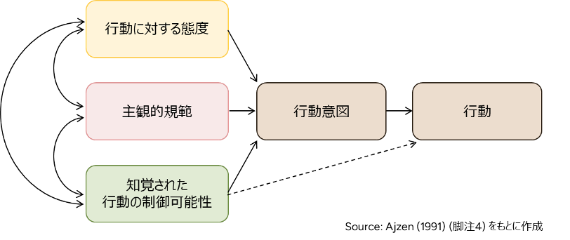 ・知覚された行動の制御可能性(Perceived Behavioral Control): 行動を実行する個人の制御能力に関する信念。行動を実行するのが容易であると感じれば感じるほど、その行動を実行する意向が高まるとされます。