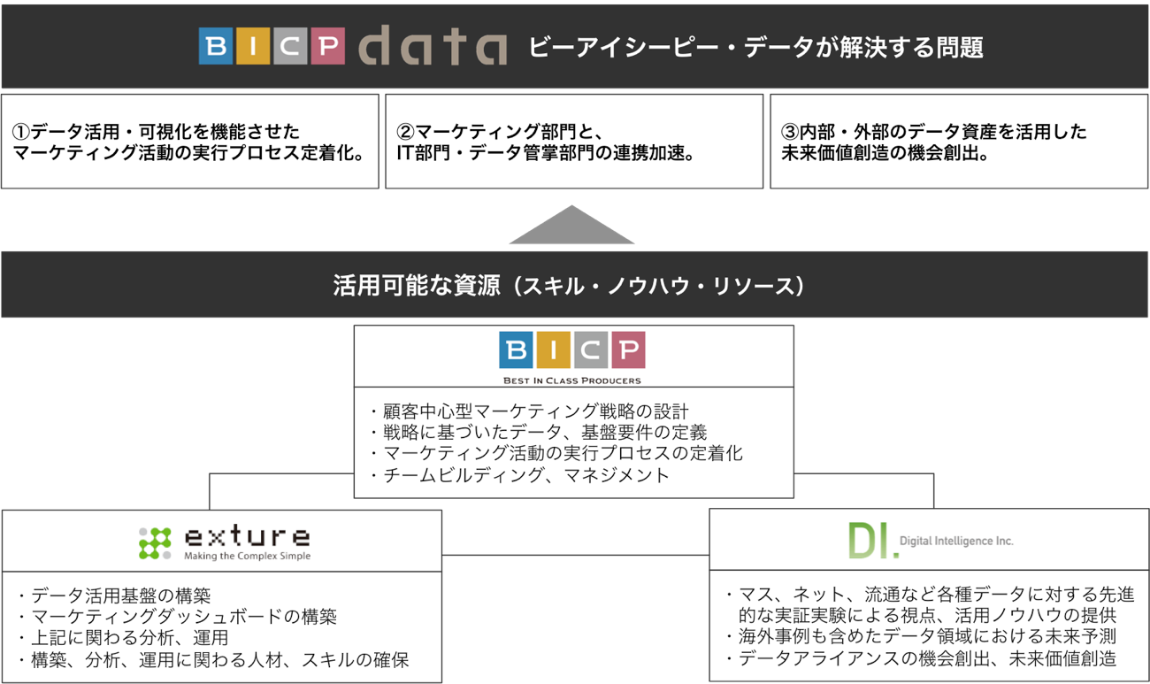 マーケティングプロデュース事業を手がけるベストインクラスプロデューサーズ(以下、BICP)は1日、データ分析を行うエクスチュア、マーケティングコンサルティングのデジタルインテリジェンスの3社で、新会社 ビーアイシーピー・データを設立したと発表した。同社は、顧客中心型マーケティングを掲げ、企業のデータ活用戦略の推進を担う。同社の代表取締役に就任したBICP 代表取締役社長 菅恭一氏は、次のようにコメントした。