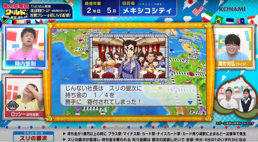 お笑い芸人の陣内智則氏、野性爆弾のロッシー氏、ライスの関町知弘氏が『桃太郎電鉄ワールド ~地球は希望でまわってる!~』で対戦プレーでLIVE配信を行なっている様子