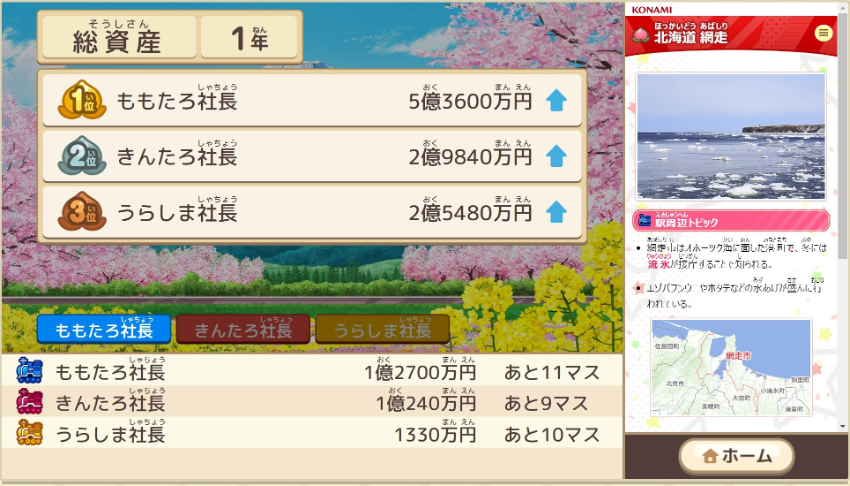 『桃太郎電鉄 教育版Lite~日本っておもしろい!~』の資産表示画面。右側に学習機能が追加されている