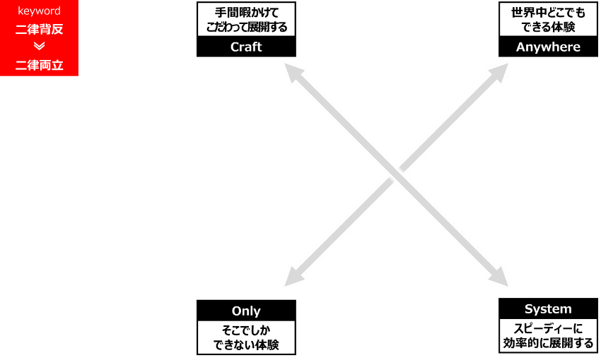 「二兎を追うものは、一兎をも得ず」ということわざがありますが、二兎を追わなければ二兎を得られない、という発想です。狭い道かもしれませんが、探求し続けて両方を手にすれば、感動体験を創出したり、ブルーオーシャンにポジショニングできたり、最終的にはビジネスの成長につながったりするという考え方です。