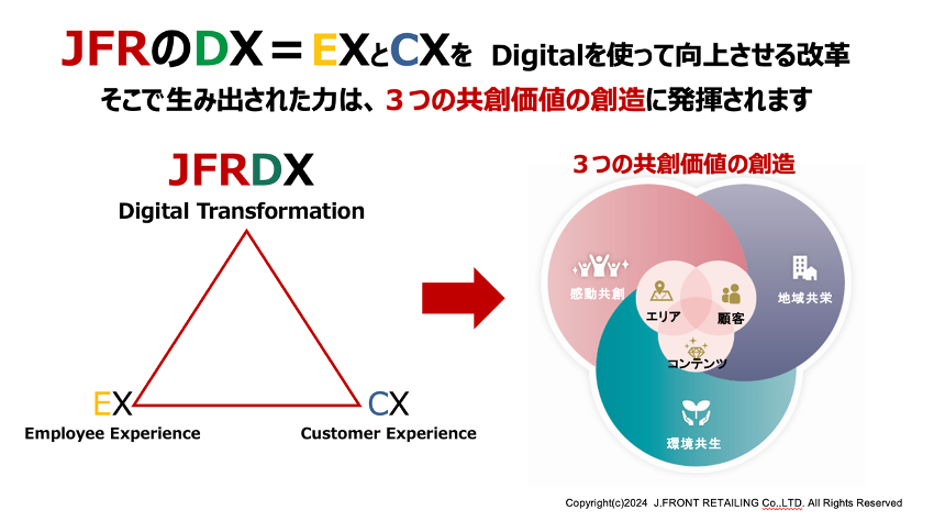 EX、CXの目的や方法は、会社や業界ごとにさまざまだと思いますが、CXばかりを重視してEXを向上させないと、結果として新しい価値創造が生まれにくいというのは、小売業界でも共通して言えることだと考えます。デジタルの力を借りてこの2つを改革し、そこで生み出された力が新しい価値創造に発揮されるのがDXです。DXは、それ自体がゴールではないことに注意が必要です。