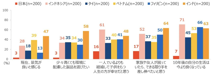 それによると、日本はキャリアアップや環境に対する価値観や景気についての意見を聞いた全ての質問で「どちらともいえない」という回答が多かった。「そう思う」という積極的な回答が多く、実際の成長率との相関をうかがわせるインドやインドネシアなどの国とは対照的だ。その結果、景気に対する実感や将来への期待、自身のキャリアアップへの意識、環境への配慮といった項目で、日本はアジアの中で低さが際立つ結果となった。