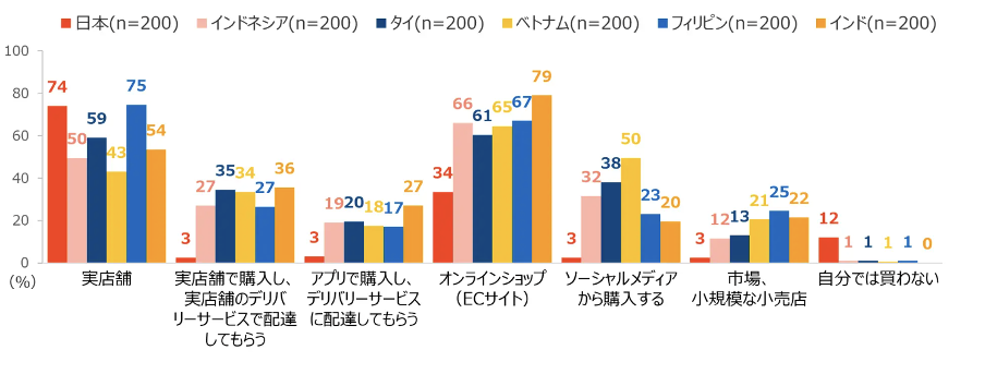一方、ベトナムでは「衣服」の購入は「ソーシャルメディア」が主流になっているなど、アジア各国で購入チャネルの多様化が進み、商品のカテゴリーごとの棲み分けも見受けられる。