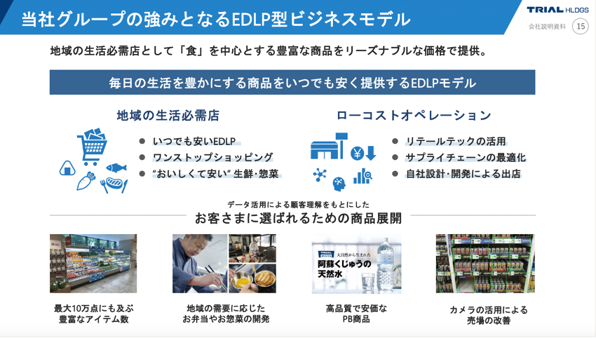 それに対してEDLP(Every Day Low Price)は、いわば特売の逆、コストをかけずに全品を安くするモデルです。トライアルも、私の古巣であり先日買収された西友も、EDLPのビジネスモデルですね。ショッキングな特価にできないのでなかなか気づいてもらえないという難点はありますが、トライアルではこのEDLPの採算性を高めていくノウハウがあると思っています。いかがですか。