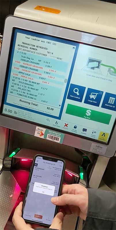 QFC(Kroger)会員アプリに買い物リストを登録していれば、現時点は「Scan,Bag,Go」と同様の購入体験ができます。ただし、クレジット登録はできないため、決済はセルフレジで行うことになります。「現時点」と書いたのは、スマホより画面が狭く情報量が少ないので、進化するとスマホアプリと別物になる可能性を感じたためです。こちらを試す場合も、会員カードは必須ですので、QFC(Kroger)アプリでの会員登録まではやっておく必要があります。