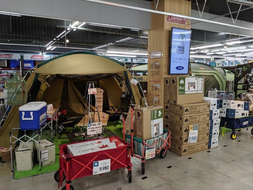 現在、アウトドアコーナーは提案型ホームセンターのような売場に、カー用品・おもちゃなどのコーナーはまるでドン・キホーテのような陳列とPOP展開になっています。