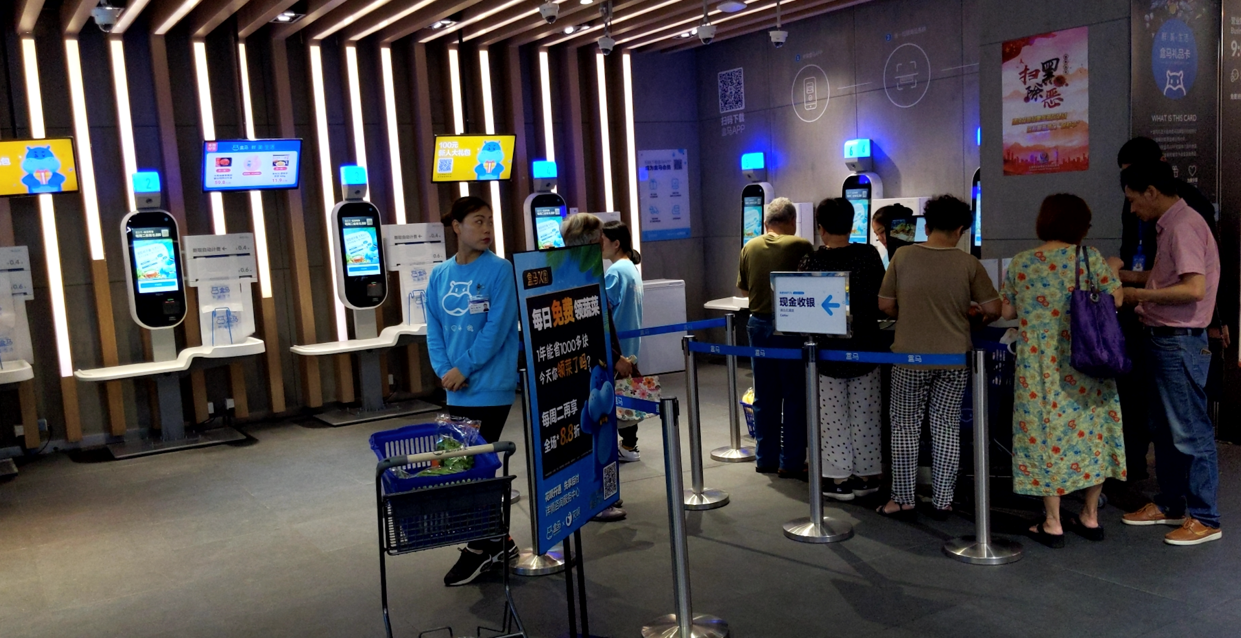 フーマーに限らず、平日の午前中~日中は、高齢者の来店が多い時間帯です。スマホ所有率が99%を超えて誰もがAli payやWeChat payを使うと言われる上海でも、この時間帯は現金決済ができる有人レジを利用する人が意外に多かった印象です。