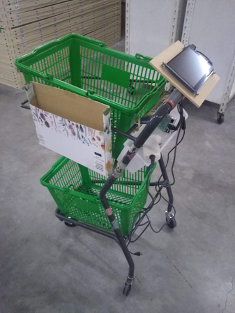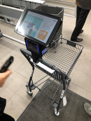 写真はそのカートピッキングシステムの試作機で手作り感満載のため小さい画像にしています。というのも、福岡市にあるトライアルさんに視察におじゃまして話題の「スマートレジカート」を初めて見せてもらったときには他人(他機?)とは思えず大変感動し、嬉しさのあまり後日セミナーで代表の方に初めてお会いしたにも関わらず熱く話かけてしまいました。