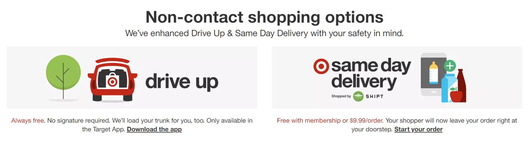 また、大手ディスカウントストアのターゲットはWebサイトのトップページ(リンク:https://www.target.com/)で、人に接触しない買い物方法を訴求し、2月のEC売上が前年比33%増から、4月は282%増と驚異的な伸びを見せています。そのEC売上の80%は、店舗在庫のBOPISまたは自宅配送です。