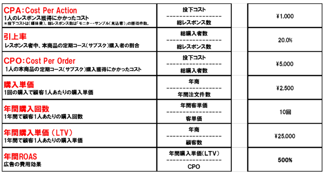 - CPO:Cost Per Order(投下コスト÷総購入者数)