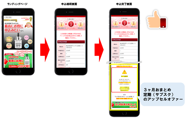 一方で、いきなり本商品の定期コース(サブスク)をオファーするワンステップマーケティングの場合は、申込完了画面でアップセルを狙う「完了画面でアップセル」が最適である。