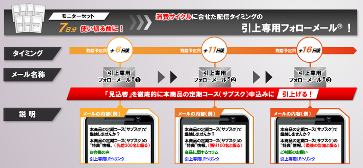 具体的には、7日分のモニター商品を申込んだお客さまには、モニター商品を使い切る直前の商品到着6日後くらいに「本商品を定期コース(サブスク)でお得に継続しませんか?」といった引上専用フォローメールを送ろう。