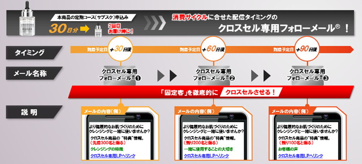 したがって、本商品の定期コース(サブスク)を申込んだお客さまには、1回目の商品を使い切る直前、つまりは1回目の商品到着30日後ぐらいにクロスセル専用フォローメールを送ると、「クロスセル率」を上げることができる。