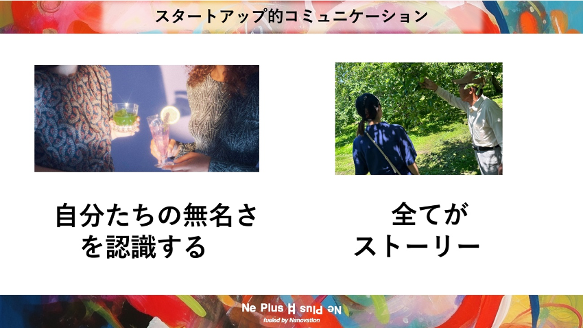 その上で、情報や商品が溢れている世の中でどのように私たちのことを知って興味を持っていただくのかというと、会社や事業のプロセスで起こるすべてをストーリーとして設計していくことだと考えています。
