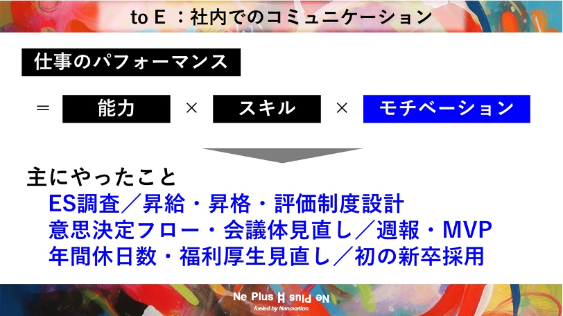 神徳 そのような条件で入社したわけではないのですが、衝突しながらも私が社長と調整して進めました。仕事のパフォーマンスは、能力とスキルとモチベーションの掛け算だと思うんです。能力はそう簡単に上がるものではないですし、スキルも習得するのに時間がかかります。そのため、モチベーションを上げるために、たとえば昇給・昇格・評価制度を構築したり、意思決定フローや会議体を見直したりしました。