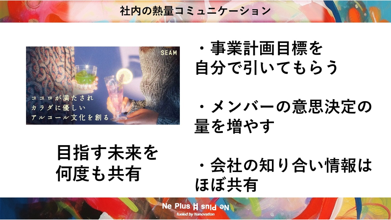 これも「自分ごと化」のひとつの策で、自分で考えて頑張ろうとなると、本人の意思決定が増えるんです。メンバーの意思決定の量を増やしながら、自分自身が考えた事業計画に対して切磋琢磨していくことが重要です。