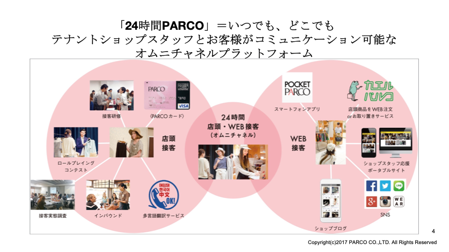 つまりパルコの売上を最大化するには、お客さま一人ひとりの満足度を上げる、その鍵となるのがテナントでの接客となります。当時の私のチームでは、お客さまを顧客ではなく「個客」と表現し、「テクノロジーの力で個々のお客さまの満足をどう最大化するか」をテーマに掲げました。そこで登場したのが「24時間PARCO」というコンセプトです。