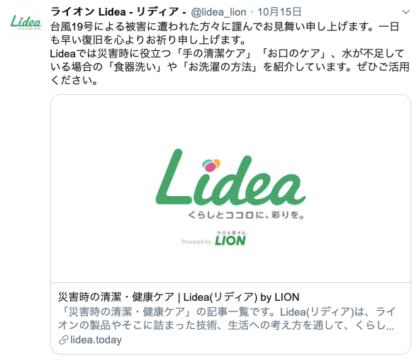 ライオンが運営する生活情報メディア「Lidea」では、台風が日本列島から離れた10月15日に、災害時の清潔・健康ケア記事一覧を投稿していた。