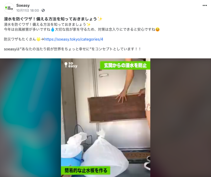 生活の中の実用的なちょっとしたアイデアを15秒動画で紹介する「soeasy」では、台風19号の接近時、蓄積したコンテンツの中から防災関連の動画をアプリやソーシャルメディアで投稿していた。