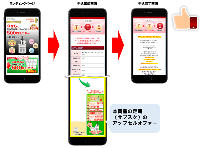 無料モニターや500円モニターを入口として、本商品の定期コース(サブスク)へのアップセル・引上を狙うツーステップマーケティングの場合は、ズバリ「確認画面でアップセル」が最強の施策だ。