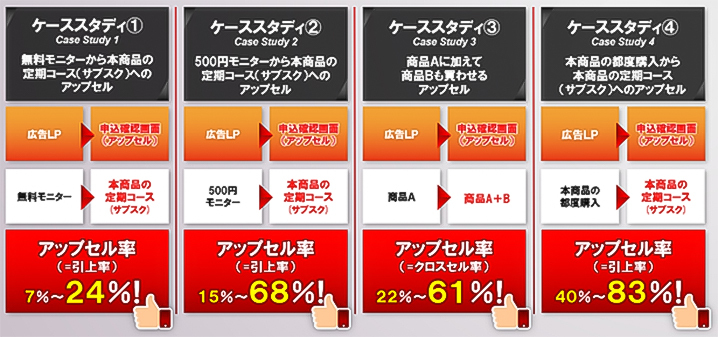 我々、売れるネット広告社のクライアント実績では、「確認画面でアップセル」により、無料モニターから本商品へのアップセル率は最大20%以上、500円モニターから本商品へのアップセル率は最大40%以上、商品Aから商品A+Bへのアップセル率(クロスセル率)は最大60%以上、都度購入から本商品の定期コース(サブスク)へのアップセル率の場合は、最大80%以上まで伸ばした実績がある。