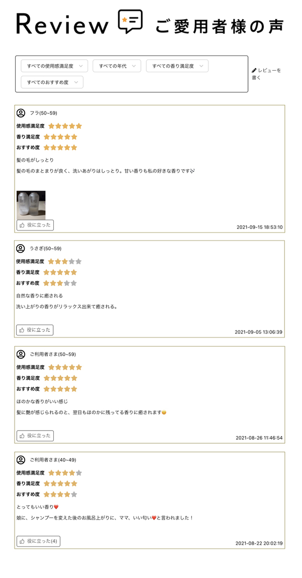 そんな大事な香りを、シャンプーを買う時に試せないオンラインは一見、不利に思いますが、実はメリットもあるようです。それは、商品購入を検討するときにゆっくりと読んでもらえる、そして何よりも「レビュー」です。企業が売り込みたいがために書いたものではなく、利害関係のない一般のお客さまの声であるがゆえに信憑性があります。