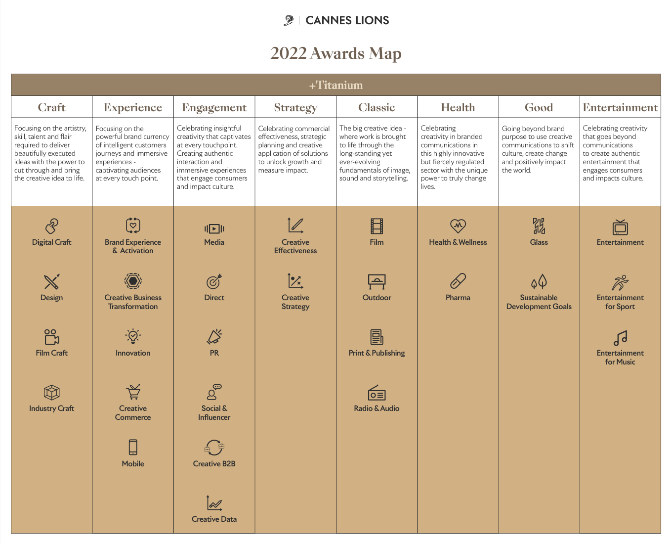 まずチタニウム・トラックに含まれるチタニウム部門は今まで、フィルム部門などが含まれるコミュニケーション・トラックに入っていたのですが、トラックとして独立した格好です。クラフト・トラックにはデザイン部門(旧コミュニケーション・トラック)が、エクスピリエンス・トラックにはイノベーション部門(旧イノベーション・トラック)とモバイル部門(旧コミュニケーション・トラック)が加わりました。