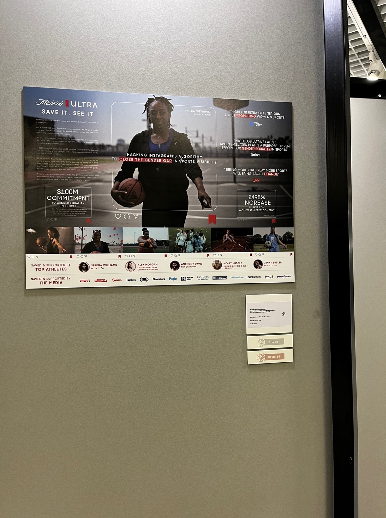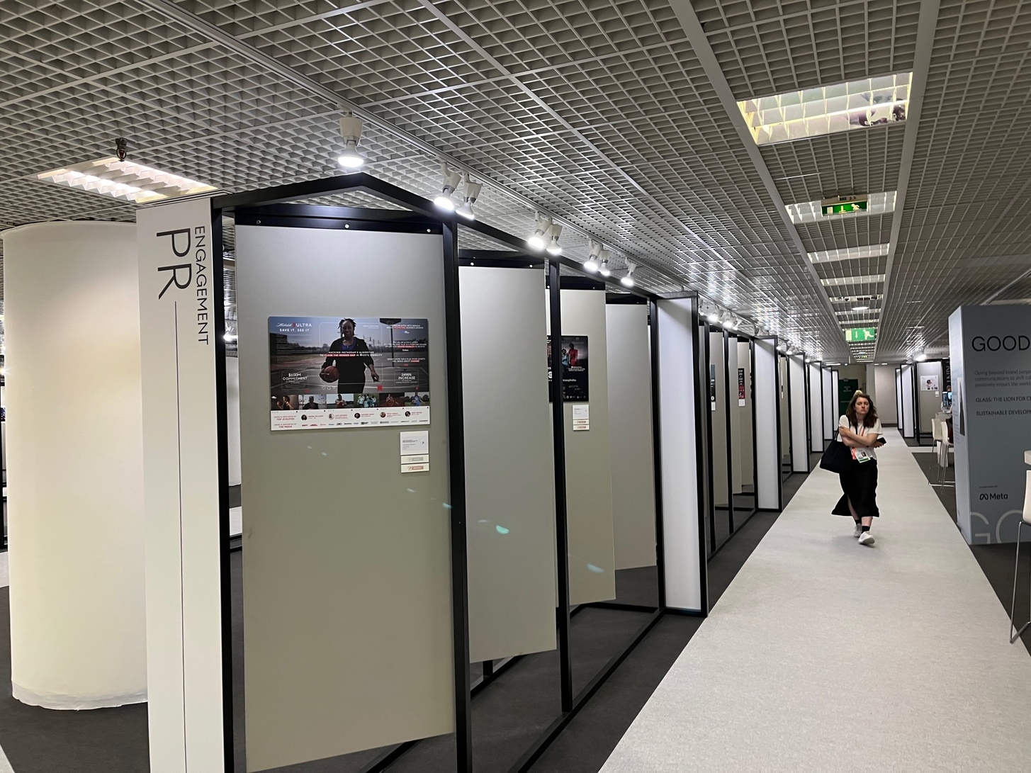 地下会場で見ることが出来る事例ボードや作品。PRが部門名でENGAGEMENTはトラック名。ショートリスト以上が掲示される。