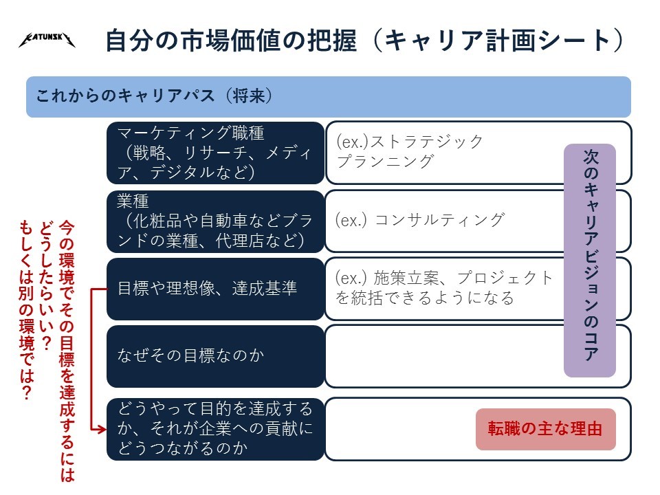 先ほどの私のケースで言えば、「デジタル以外のマーケティングタッチポイントすべての統合戦略と実施施策経験を積む」といったものです(私の場合は、さらにそのすべてを束ねるコアとしてのCRMへのフォーカス、がありました)。