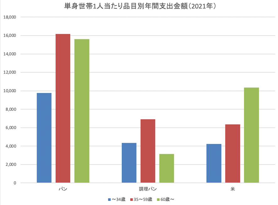 - 和菓子の主要顧客である高齢者はパンの購買頻度が高くない。単身世帯の統計を見ると、若い年代ほど外食支出が多く(34歳以下 年186,302円、35~59歳 年130,646円、60歳以上 年58,052円)、主食への支出が少ない。主食である食パンなどに関しては高年齢世帯の支出が多い傾向にあるが、数日食べられる食パンよりも買上げ頻度が多い調理パンの購入は少ない。