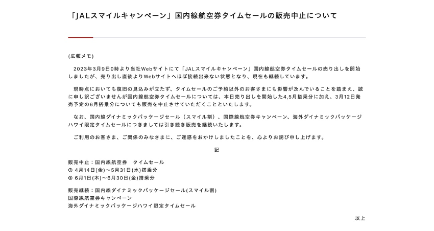 JAL(日本航空)は、2023年3月9日午前0時からすべての国内線の片道料金が6600円になる「JAL スマイルキャンペーン」(国内線航空券タイムセール)を開始した。しかし、開始直後から申込みが殺到し、Web サイトはほぼ接続できない状態となり、その後も復旧の見込みは立たず、タイムセール以外の国際線の予約などにも影響が及んだ。同社は4、5、6月搭乗分の国内線の航空券販売を同日14時30分に中止することを発表し、HPで謝罪するに至った。