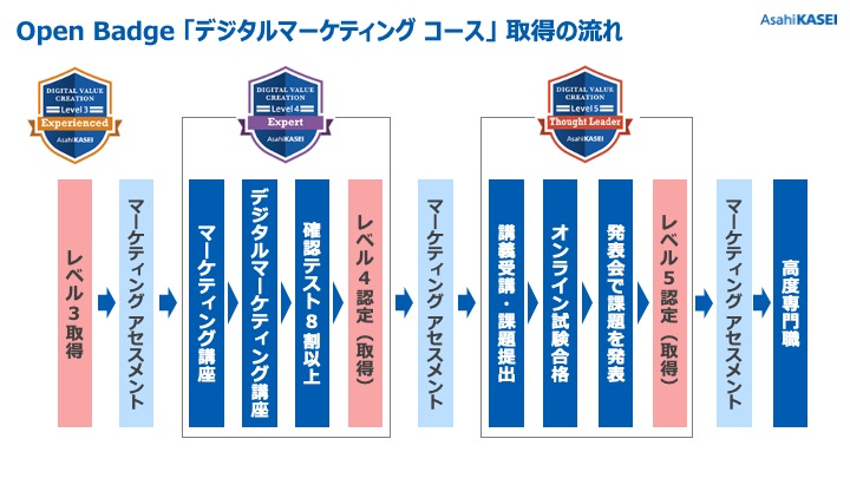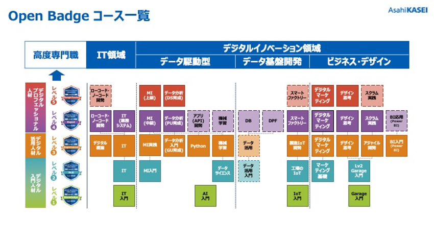 この中で鍵になるのが「デジタルプロ人材の育成」です。そこでOpen Badge制度を導入し、研究開発や製造、基盤、営業・マーケティング分野のコースを用意しています。コースごとにレベル1から5までの設定があり、レベル3までをデジタル活用人材、レベル4以上をデジタルプロ人材と位置づけています。2024年をデジタルノーマル期として、全従業員4万人がデジタルのマインドセットで働くことを目指しています