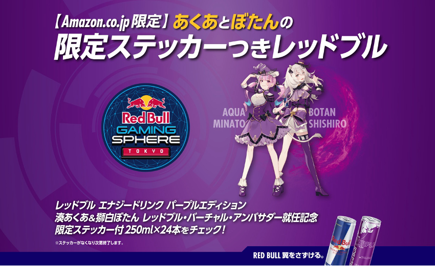 エナジードリンクのレッドブル社が2021年に「レッドブル・エナジードリンク パープルエディション」という巨峰フレーバーの商品を期間限定かつネット限定で販売開始しました。当社とコラボレーションし、所属タレントである「湊あくあ」さんと「獅白ぼたん」さん2人のバーチャルアンバサダー就任記念という形でステッカーを付けてAmazonで発売したところ、深夜0時の販売開始にもかかわらず、わずか30分で完売しました。