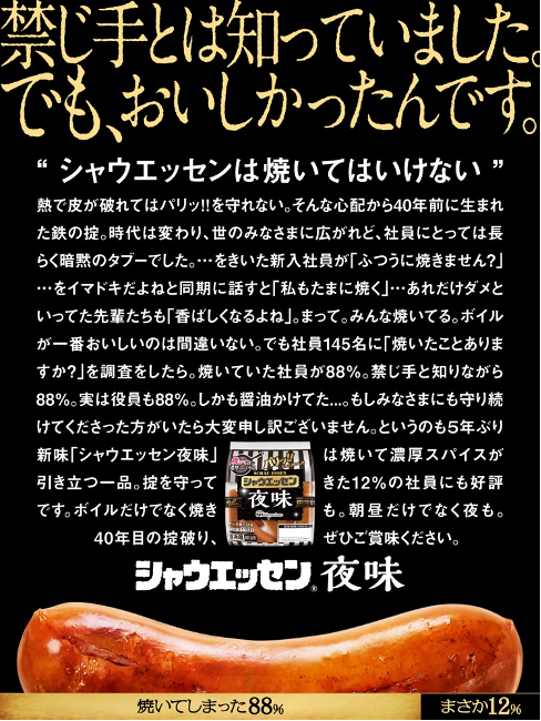 従来のシャウエッセンはボイル調理を推奨しているが、「シャウエッセン 夜味」では「焼き調理」を推奨した広告