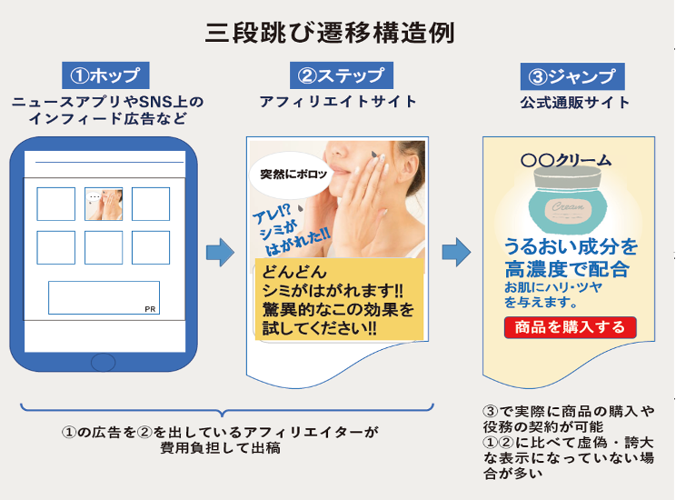 ネット上の広告・表示に対して苦情が増えたのは、2015年頃からネット広告の販売メニューとして始まった「インフィード」広告と、以前からあるアフィリエイトプログラムの組み合わせによる「三段跳び型の悪質な広告・表示」(下図参照)が横行したことに起因しています。