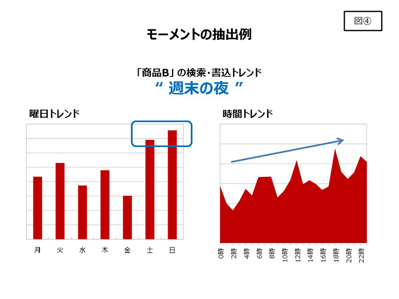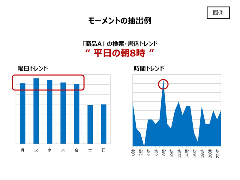 次の図③は、商品Aの検索・書込の曜日・時間帯を分析した結果です。曜日別に見ると、週末よりも平日の方が商品に対する関与が高い傾向が見られます。また時間帯別に見ると、朝8時頃に関与が非常に高くなっています。商品Aでは「平日朝8時」というモーメントの候補を抽出することができました。