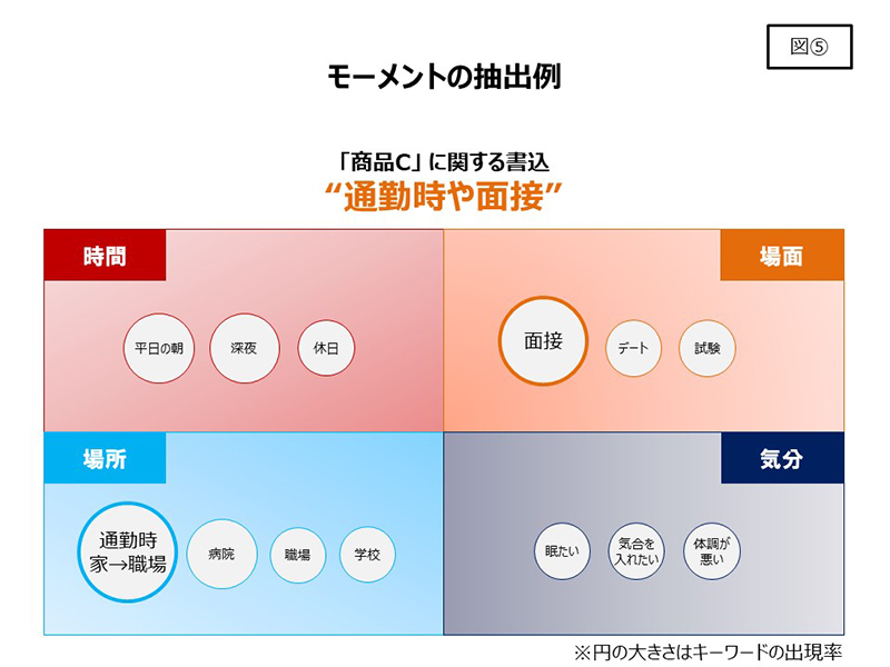 検索データやSNS(ソーシャルメディア)の書込データをテキストマイニングなどの手法を用いて分析することによって、「時間」のみならず「場面」「場所」「気分」といったモーメントの候補を抽出することもできます。図⑤は商品CのSNS(ソーシャルメディア)の書込データの分析結果です。商品Cでは「通勤時」や「面接」といったモーメントを抽出することができました。